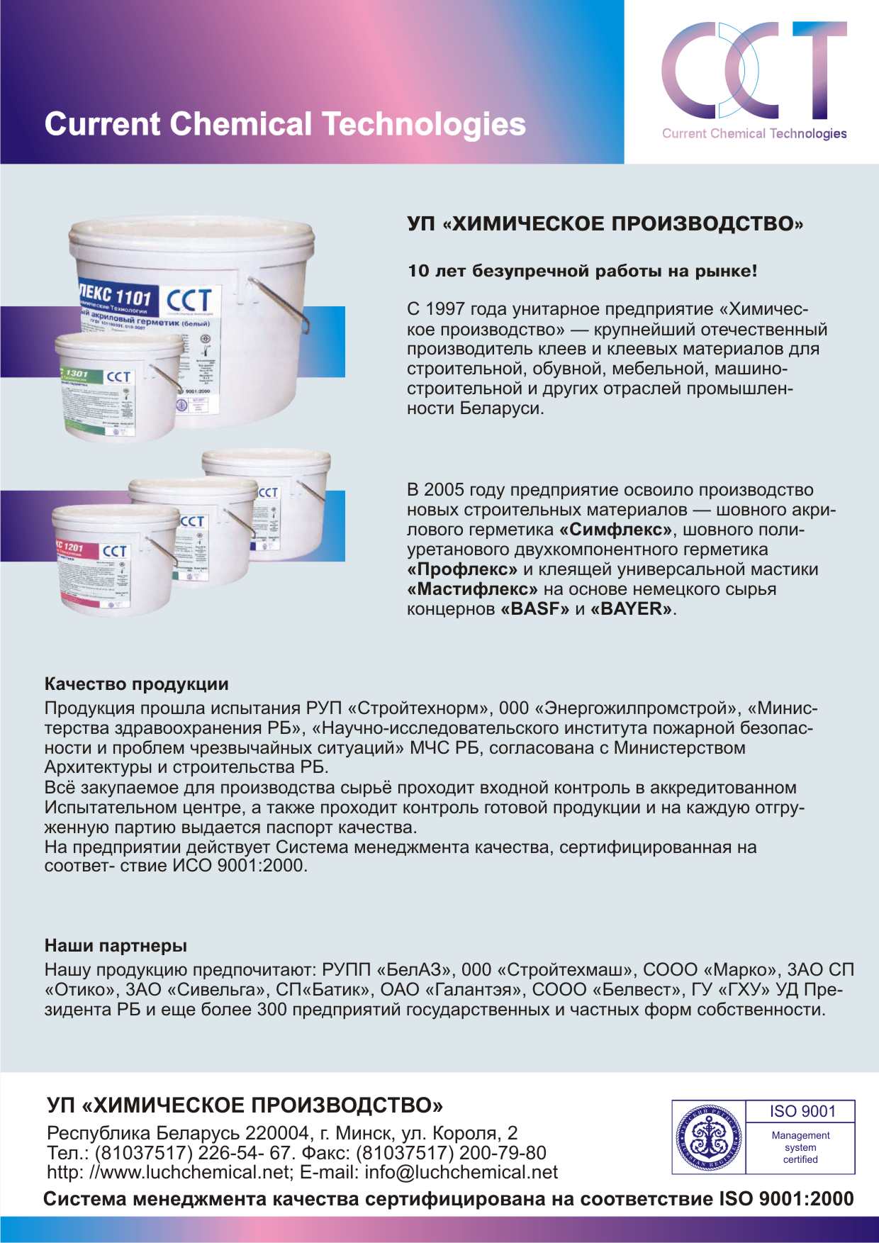 Более 20 лет опыта в производстве клеев для обувной промышленности, налаженные взаимоотношения с лучшими поставщиками сырья позволили предприятию сразу занять ведущие позиции на белорусском рынке. Химическое производство УП использует для производства лучшее сырье, закупаемое напрямую у отечественных и зарубежных производителей. Наши клеящие материалы технологичны и удобны в применении На рынке Российской Федерации наша продукция Химическое производство УП представлена под торговыми марками «Луч» и «Керафлекс».220004, Minsk, Str. Korol 2-116